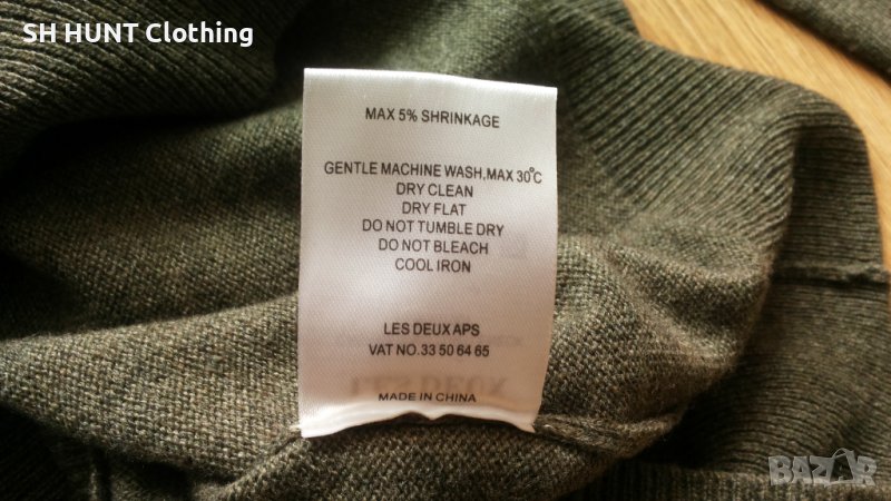 Марка: LES DEUX 90% Merino Wool 10% Cashmere - поло 90% Мерино вълна 10% Кашмир Размер: L - ширина под мишниците при нормално положение 60 см , разтяга се до 75 см , дължина 78 см без яката , 89 см при вдигната яка.