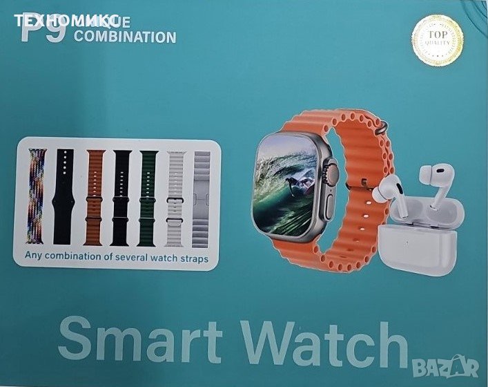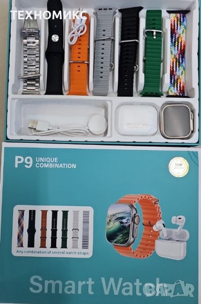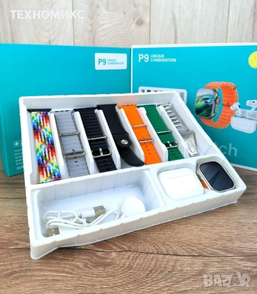Смарт часовник P9 със слушалки и 7 различни каишки подходящи за всеки повод.