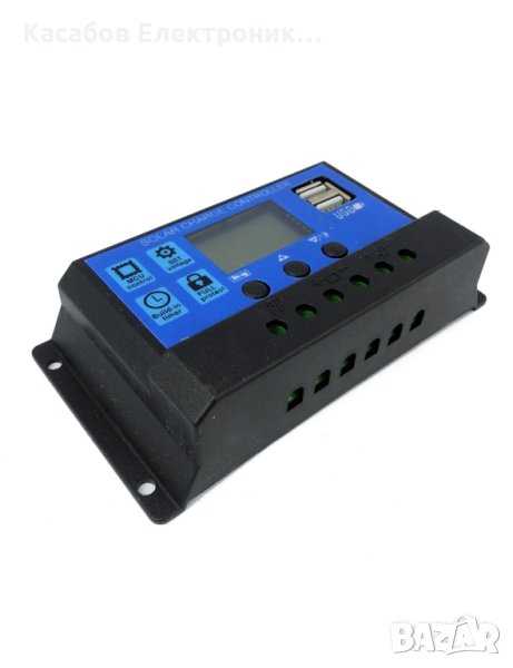 Прост соларен контролен модул с LCD дисплей и 2x USB порта. Проектиран е да поддържа 12V и 24V инсталации и максимален ток до 30A. Работи с гел, оловни и AGM батерии и допълнително ви позволява ръчно да зададете обхвата на напрежението за зареждане и разреждане, така че да можете да избирате параметри за нестандартни клетки.