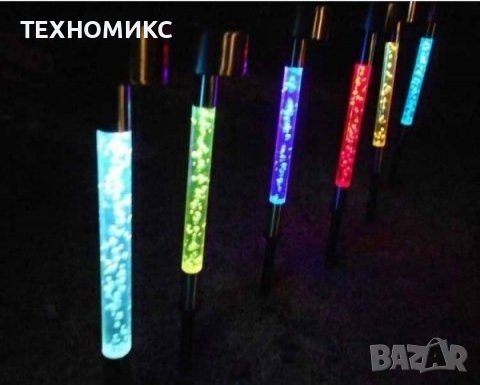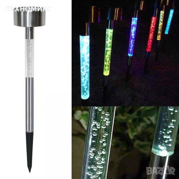 Соларната лампа е изработена от висококачествен материал: неръждаема стомана. Красивият й дизайн я прави атрактивна и красива. Представлява прозрачна тънка тръба в която има различни водни мехурчета, които са в различни цветове. Соларната лампа е подходяща да се използва на открити пространства. Сложете я в двора, градината, на алеята си. За тази цел тя е снабдена с колче за забиване.
