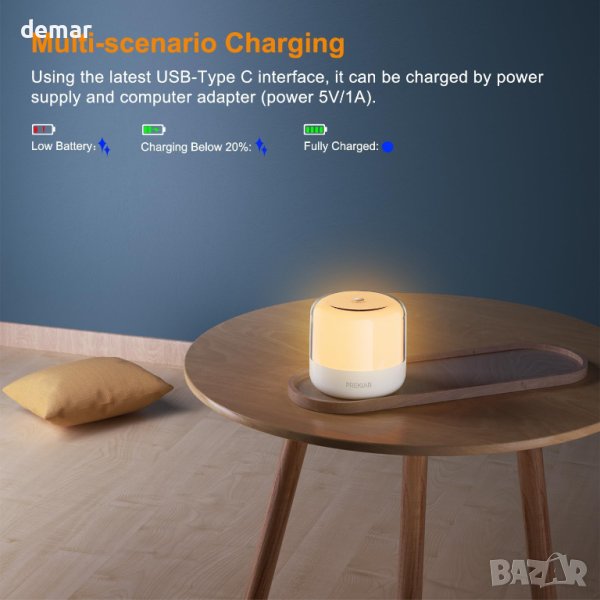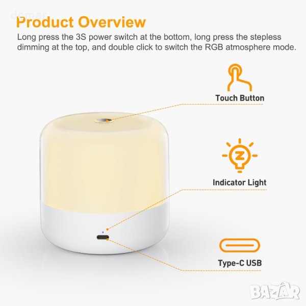 нощна лампа със завладяващ цилиндричен дизайн и кристално чисто осветление. Тя работи на 4 W със захранване и 2 W в режим на батерия, предлагайки гъвкавост за различни сценарии. Управлявайте я лесно със сензорен бутон за режими включване/изключване и топло бяло/RGB. Регулирайте яркостта за перфектната атмосфера и се наслаждавайте на непрекъснато осветление за 4-50 часа с вградената батерия. Бързо 3-часово зареждане чрез Type-C кабел. Сертифициран от UKCA/CE/ROHS за качество и безопасност. Стилно и универсално решение за осветление за вашата спалня.