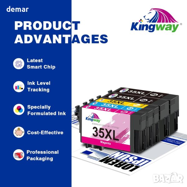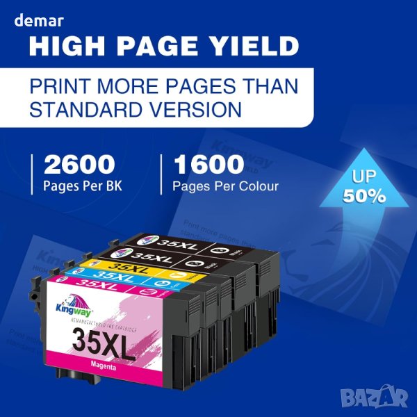 Мастилото Kingway 35XL, преработено за касети с мастило Epson 35 35XL, включва 2x 35XL черни, 1x 35XL циан, 1x 35XL магента, 1x 35XL жълти касети и ръководство за потребителя. Тези касети са съвместими с принтери Epson WorkForce Pro WF-4740DTWF, WF-4730DTWF, WF-4725DWF, WF-4720DWF, WF-4740, WF-4730, WF-4725, WF-4720 и предлагат висок капацитет от приблизително 2600 страници на черно и 1900 страници на цвят при 5% покритие на хартия A4. Касетите се доставят с най-новите подобрени чипове за висока съвместимост и са проектирани да работят надеждно. Те произвеждат живи цветове, ясен текст и богати черни отпечатъци, които издържат десетилетия. С висок капацитет на страници за намаляване на разходите за печат, тези касети са идеални за ежедневна употреба на част от първоначалните цени. Всяка касета е индивидуално запечатана, напълно тествана и преминава през строг контрол на качеството, което прави Kingway разумен избор за ежедневни задачи за печат.