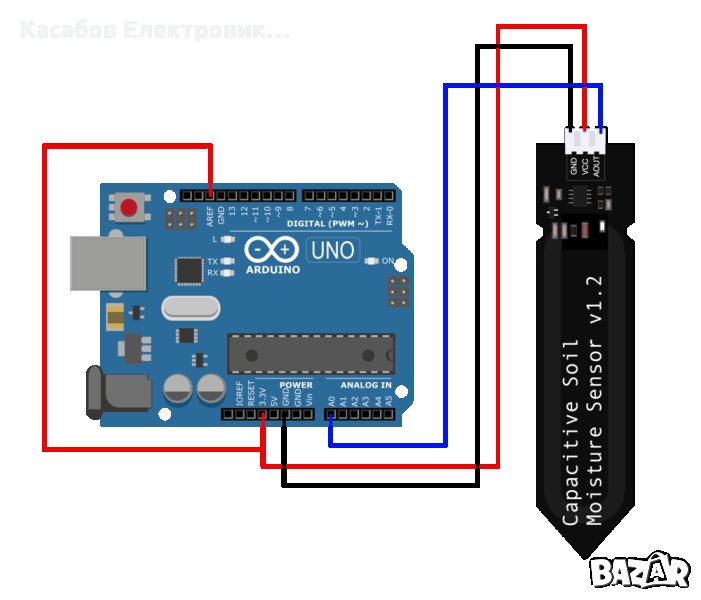 Благодарение на капацитивното измерване го няма проблемът с бързата корозия, което значително увеличава живота на сензора, който е значително по-дълъг от този на съпротивителните сензори. На изхода има напрежение в диапазона 0-3V, което определя степента на влажност на почвата.
