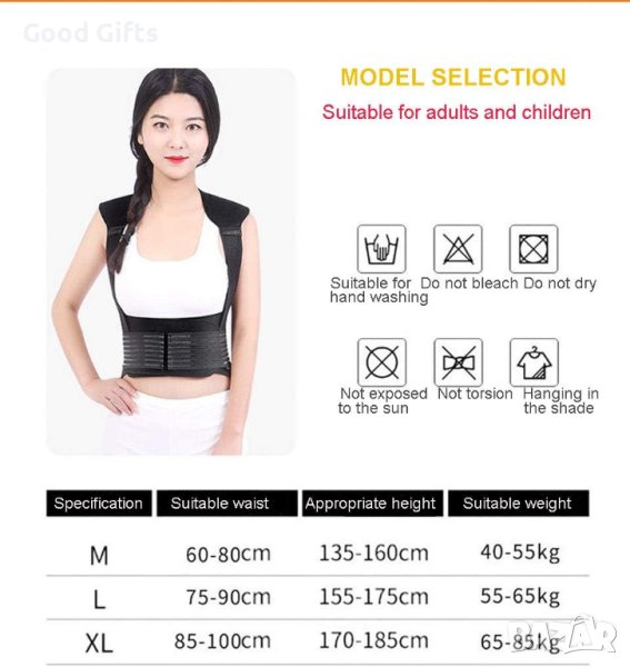 Голям размер - XL. Става и за по-пълни хора. Саморегулиращи се лепенки. За хора с по-тънка талия просто използвайте двете допълнителни лепенки, намиращи се отстрани на колана и ги залепете както е показано на последната снимка, фигури 3 и 4. Дължина на колана в неразтегнато положение 120 см. Дължина на колана в разтегнато положение 130 см. Височина 54 см.