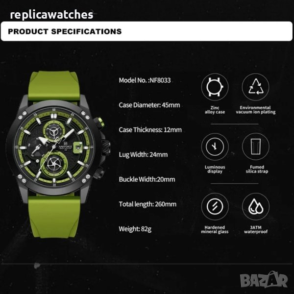 Case Thickness12mmBand Width24mmBand Material TypeSiliconeCase ShapeRoundDial Window Material TypeHardlexBoxes & Cases MaterialPaperDial Diameter45mmFeatureShock Resistant,Luminous,Complete Calendar,Water Resistant,luminous handsWater Resistance Depth3BarClasp TypeBuckleBand Length26cmCase MaterialAlloyMovementQuartzStyleSPORTBrand NameNAVIFORCEOriginMainland Chinawristwatch mensmen wrist watchFeatureChronograph watch men