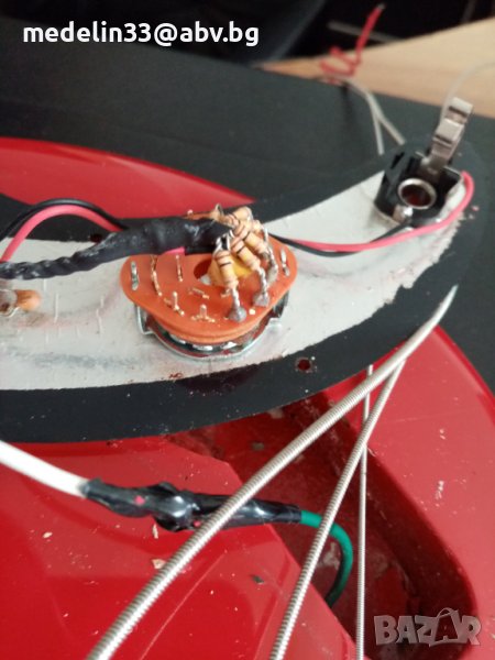 Единственните промени които направих са подмяна на волюм потенциометъра с нов 500 ком и монтирах 6 позиционен тон коректор без батерия. Също така екранирах допълнително пикгарда и тялото, както се вижда от снимките.