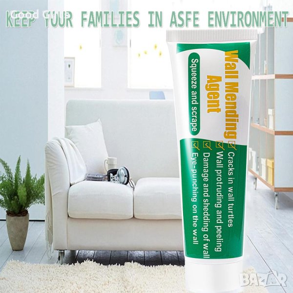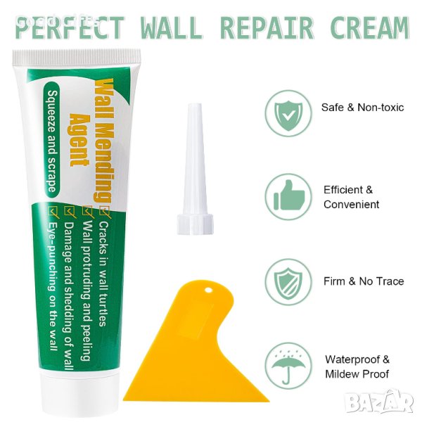 - Този продукт може да се нанася върху мокри стени без проблем. В случай на по-големи дупки в стената, запълнете ги с дърво или пирони, преди да нанесете ремонтната паста. След приключване на ремонта и изсъхване на стената се препоръчва боядисване. Ако ремонтираната стена трябва да бъде бяла, се препоръчва да я пребоядисате с подходящ цвят след приключване на ремонта.
