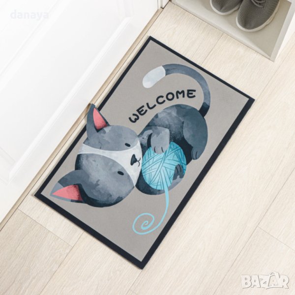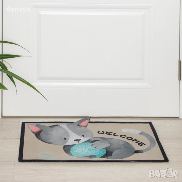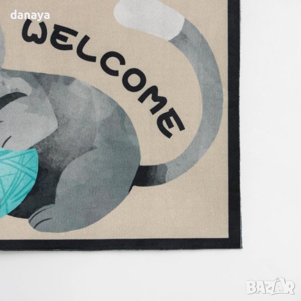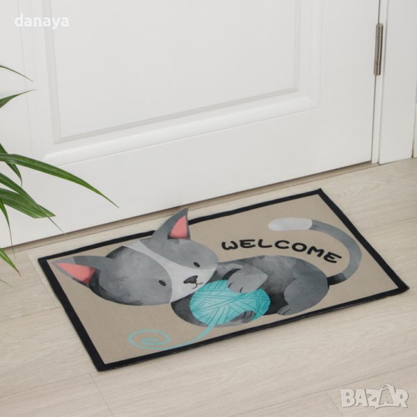 Мека изтривалка за баня или входна врата с много симпатичен принт принт на малко котенце с кълбо от прежда и надпис Welcome. Чудесен декор за дома. С приятна на допир горна част и с антиплъзгаща се долна част.