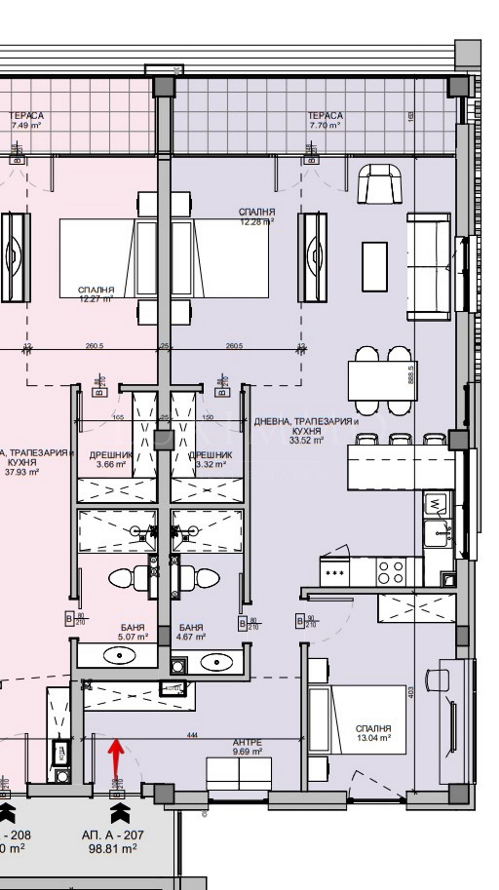 Имотът е ситуиран на 1-ви етаж и предлага 122.08 кв.м обща площ (нетна площ 98.82 кв.м + общи части 23.26 кв.м). Състои се от входно антре, всекидневна с кухненски бокс, дрешник, спалня, баня с тоалетна, тераса. Има възможност в преустройство в тристаен апартамент. Предлага се в степен на завършване 'до ключ' с готови настилки (паркет), стени, завършени и оборудвани бани; дървена, трислойна дограма, немски профил, с троен стъклопакет и алуминиева капачка, предпазваща дървото от студ и слънце за да служи дълги години; блиндирани входни врати и MDF интериорни врати, инсталирани радиатори и система Smart-home, включена в цената. Отоплението е предвидено с индивидуално парно на газ и радиатори.