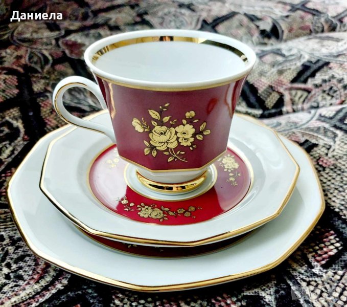 Троен сет Winterling marktleuthen Bavaria. Произведен между 1950- 1970 г.Зелена версия на маркировка. Олично запазен сет със златен кант.Размери:Чашка -Височина 7см Диаметър 7.7см