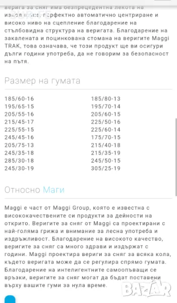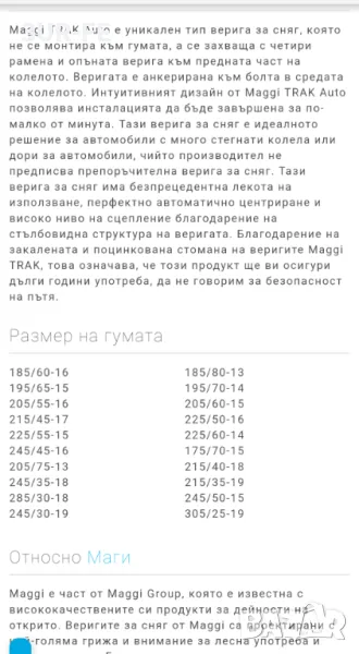 Maggi TRAK е уникален тип верига за сняг, която не се монтира към гумата, а се захваща с четири рамена и опъната верига към предната част на колелото. Веригата е анкерирана към болта в средата на колелото. Интуитивният дизайн от Maggi TRAK Auto позволява инсталацията да бъде завършена за по-малко от минута. Тази верига за сняг е идеалното решение за автомобили с много стегнати колела или дори за автомобили, чийто производител не предписва препоръчителна верига за сняг. Тази верига за сняг има безпрецедентна лекота на използване, перфектно самоцентриране и високо ниво на сцепление благодарение на стълбовидна структура на веригата. Благодарение на закалената и поцинкована стомана на веригите Maggi TRAK, това означава, че този продукт ще ви осигури дълги години употреба, да не говорим за безопасност на пътя. Цена в магазин 400E евро.