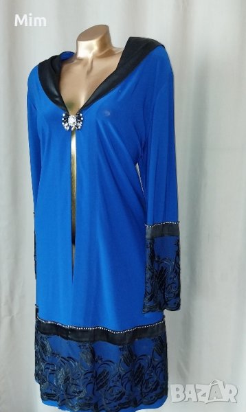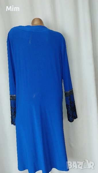 Син еластичен халат с дълъг ръкав със сатенен черен ревер с черна дантела на ръкавите и отдолу, закопчаването е отпред с бройка/ забележка някой камъчета са паднали / показано на последната снимка н по едър план, съобразно с цената .Подгръдна 60 см едностранно има голяма еластичност, надолу се спуска свободно, разширява се най долу до 75 см едностранно, дължина 105 см.По етикет е 52 но според мен е мо малък дала съм размера в см.