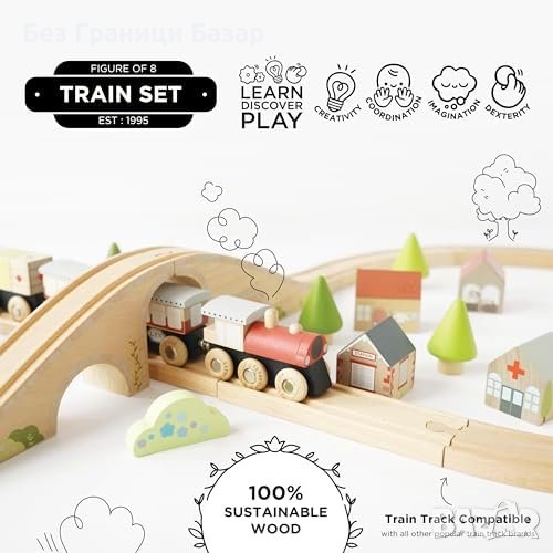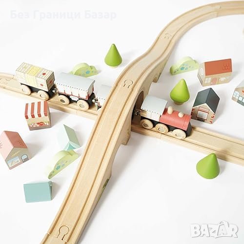 - Интерактивен дървен влаков комплект: 40 части за стимулиране на въображението и когнитивното мислене.