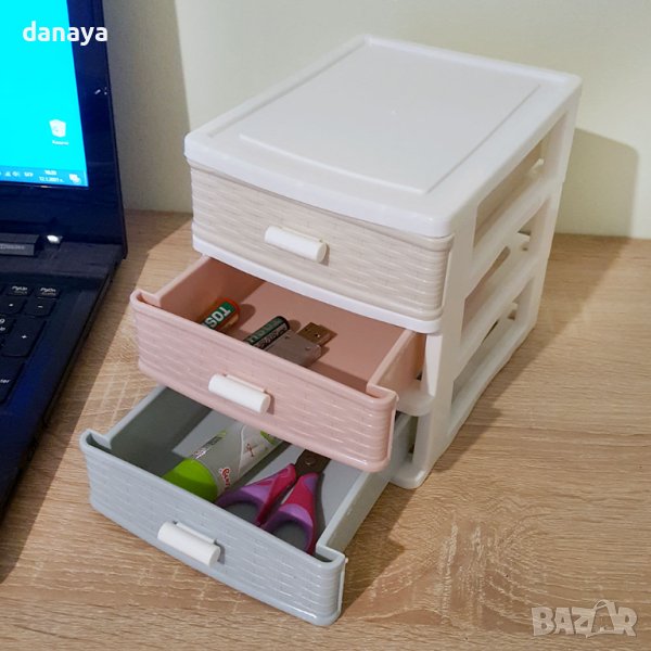 Малко пластмасово шкафче с 3 цветни чекмеджета. Чудесен органайзер за бюро, скрин или върху шкаф. В него може да съхранявате всякакви дребни неща като батерии, USB флашки, козметика, USB кабели, кламерчета, химикали и други ученически пособия или всичко дребно, което може да се изгуби, а искате да ви е винаги под ръка. Основата е бяла, а чекмеджетата са в много нежни цветове.