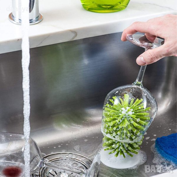 Четка за миене на чаши с вакуумно закрепване за мивката. Това е четка със здрави, средно твърди косми с дължина 3см всеки. Разположени на гъсто с цел по-добро изчистване на замърсените чаши. Самата четка е висока 16 см и е подходяща за измиване на почти всички видове чаши. Подходяща е за миене на водни чаши, чаши за чай или кафе, също така и винени чаши със столче. В основата си четката има стабилна вакуум вендуза, с чиято помощ можете да я закрепите към всяка една мивка с гладка повърхност. Четката стабилно се прикрепя към мивки от неръждаема стомана (алпака), но може да се закрепи и към други повърхности – например плочки. На вендузата има малко ушенце с помощта на което лесно може да отлепите четката от повърхността, на която сте я залепили.