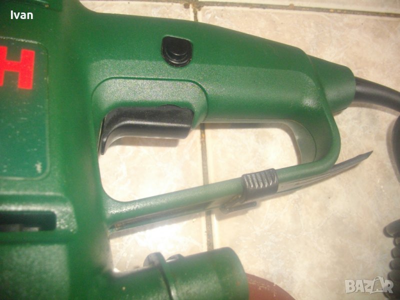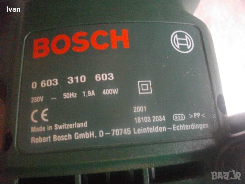 ОПИСАНИЕ на ел. кръгъл ексцентър вирошлайф Бош - 199 лв. Почти нов, с много запазен външен вид и отлично техническо състояние. Оригинален швейцарски висококачествен модел на марката. Марка и модел - BOSCH PEX 400. Произовдство 2001 г - Madе in Switzerland - вписано и маркирано на фабричния стикер. Машината е без забележки. Мощност на мотора - 400 вата, защита 1,9 ампера, регулация скорост регулируема 6 степени. Предна регулируема дръжка, заден конектор на отпадъчна прах. Автостоп на спусъка. Оригинален многожилен гумиран кабел, оригинален щепсел. Работен плот тип пита Велкро ,със самозалепващи елементи - като нов, без забележки, велкрото държи здраво и стабилно поставена шкурка. Размери на плота - за шкурки ф 125 мм. Поставена на машината нова немска шкурка за проба и тест.