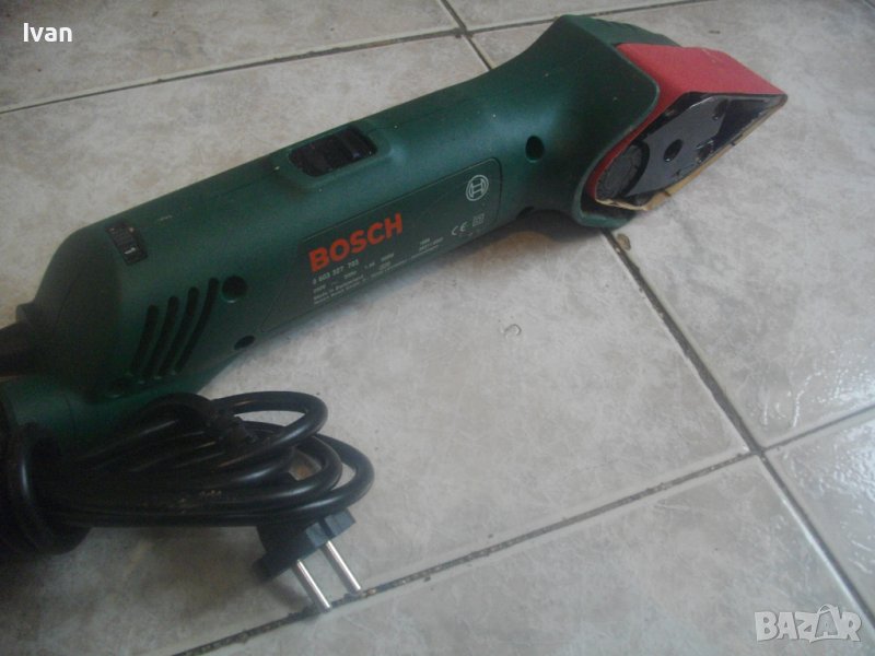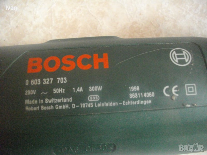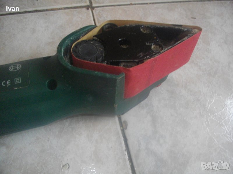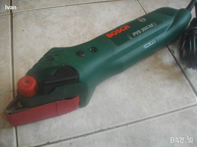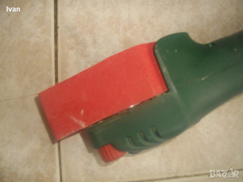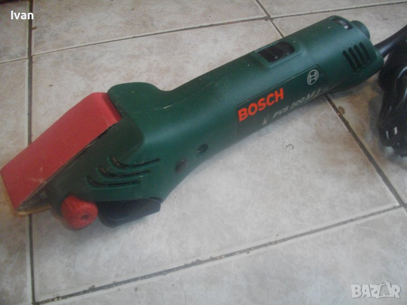 ОПИСАНИЕ на мини лентов шлайф двстранен Бош - за шлайфане труднодостъпни места - цена 199 лв. Марка и модел - BOSCH PVS 300AE Electronic. Оригинално швейцарско старо качество 1998 г - Made in SWITZERLAND. Производител - Robert Bosch GmbH - Leinfelden - Ehterdingen. Машината е почти нова, без забележки по визия и работно състояние. Отлично техническо/работно състояние. Предназначение - за шлайфане в труднодостъпни и тесни места и повърхности. Шкурковия пояс обхваща и двете старин на шлифовъчните плотове рамена на машината отпред. Мощност на мотора - 300 вата, защита - 1,4 ампера, скорост 180-240 м/мин. Горен пусков ключ с приплъзване. 6 степени на регулация на скоростта. Тегло на машината - 1,6 кг. С 1 бр. нов шкурков пояс оригинален /правен/.. Шкурки/пояси могат са правят от всеки, като се режат ивици платова шкурка и се залепят на нужната за плочата ширина и дължина. Размер на шкурката пояс - 40 х 303 мм. Разполагам с друга бройка от модела машина, чисто нова, в оригиналния швейцарски кашон.