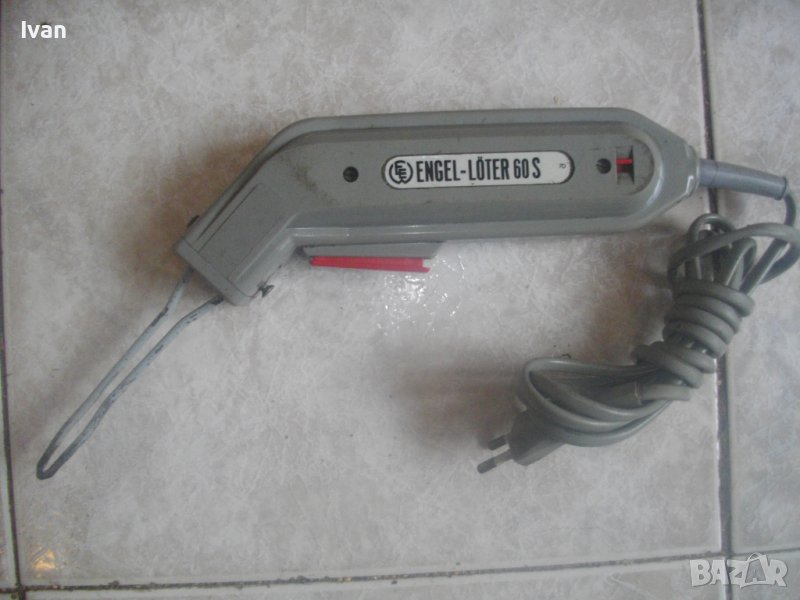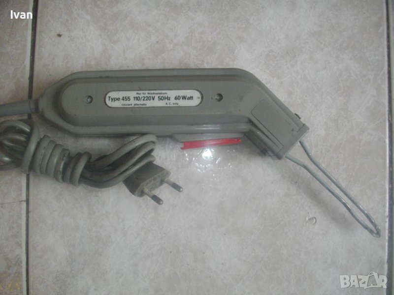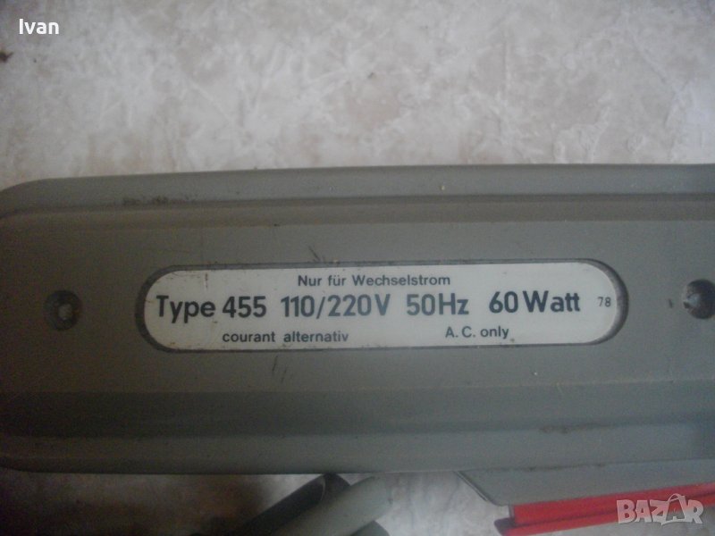 ОПИСАНИЕ на ел.лепачка за пластмаси - цена 159 лв. Машината е тип поялник за пластмаси, посредством дълга двойна човка. Старо качество производство. Запазен външен вид и отлочни работно/техническо съсотяние. Марка и модел -ENGEL_LOTER 60S Type 755 . Немска производство 1978 г. Западна Германия. Дължина човка - 105 мм, двойна човка. Страничен пусков ключ. Корпус - твърда пластмаса. Спусък голям и удобен, разположен отдору на корпуса. Дължина на машината без човката - 200 мм. Характерситики на машината - захранване 110/220 волта /работи и на 110 волта и на 220 волта, без допълнително устройство/. Мощност - 60 вата. Допълнителна маркировка - Nur Fur Wechselstrom.