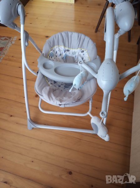 Напълно запазена, без забележки бебешка електронна люлка в комбинация с шезлонг марка Саngaroo Swing Star в която бебето може да спи, играе, да се храни-има масичка или да се застопори като шезлонг, подходяща за момче или момиче. Размери 64х88х74 см, за бебета от 0 до 6 месеца, до 9 кг, 5 скорости за люлеене, 5 мелодии с природни звуци, 16 приспивни песнички , регулиране на звука, таймер, дистанционно управление, захранва се с адаптер или батерии.