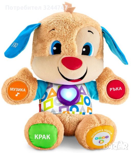 Мъничето ви може да учи, докато се забавлява с помощта на образователната играчка на Fisher Price. Тя ще се превърне в най-любимото занимание на детенцето. Възможността на интерактивното кученце да говори и пее, ще забавлява и впечатлява мъника. Играчката е със Smart Stages технология, която позволява да бъде избрано най-подходящото забавление за всеки един етап от растежа на детенцето. Ръчичките, крачетата, коремчето със сърчицето и ушичките на кученцето се активират при допир. Те ще занимават мъничето с повече от 50 песнички за припяване, забавни фрази и звуци, ще му представят частите на тялото, цветовете и буквите и ще го научат да брои. Подарете на вашето момченце играчка, с която ще се забавлява и учи по едно и също време. Играчката ще развие фината му моторика и сетивните му умения. Тя е изцяло на български език!