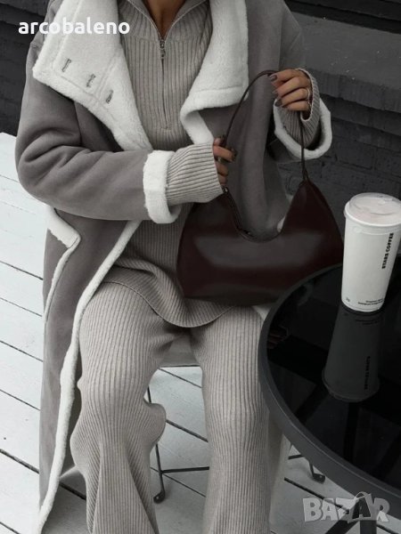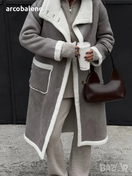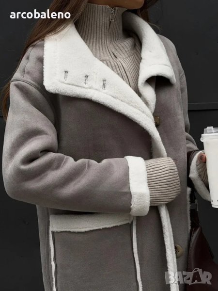 кожа с джобове в сиво и бяло, едно цяло кожено палто с ревер