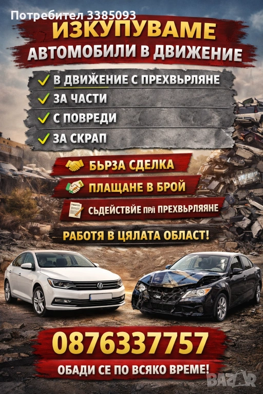 Купувам автомобили в движение може и развалени или бракувани идвам на място.