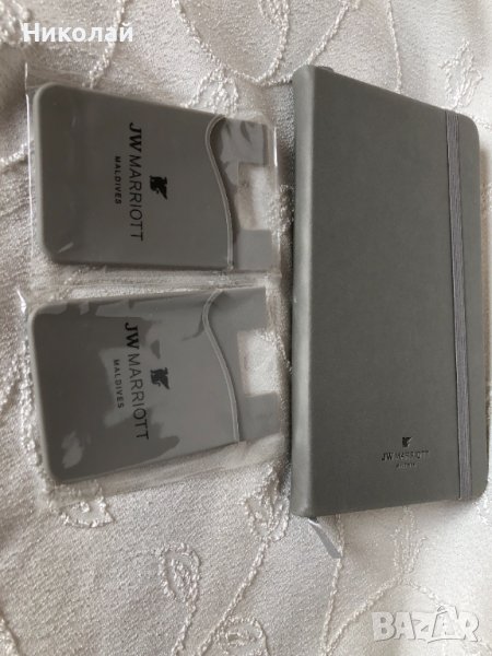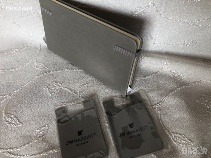 Тефтер от естествена кожа с твърди корици. Размери – 8 см х 10 см x 1.5 см. 154 линирани страници / 77 листа/ с широки редове. С еластична лента за затваряне и памучен книгоразделител. Брандиран JW MARRIOTT Maldives.