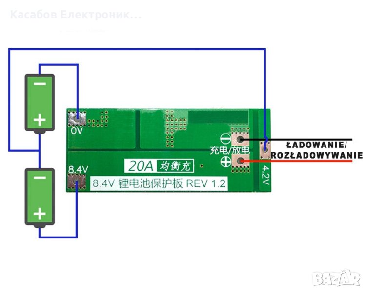 BMS 2S модул за управление на зареждането и разреждането на литиево-йонни батерии, издържащи на ток от 20А при продължителна работа. Той ще гарантира, че напрежението на клетката не пада под 2,5 V - 3 V, нито се зарежда над 4,25 V - 4,35 V. Има защита от късо съединение. Този модел е подходящ за електрически инструменти с висока консумация на енергия, например електрически отвертки. Моля, не забравяйте да го използвате в устройства с начален ток под 25A и мощност под 50W.