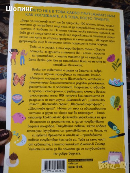 Всеки от съветите е даден на базата на съвременни научни изследвания по темите, които авторът определя като Щастливата четворка – положителни взаимоотношения, редовни упражнения, достатъчно сън и осъзнатост. Поднесени с чувство за хумор и самоирония, с разбираеми схеми и весели илюстрации, тези 100 пътечки към щастието са разделени на пет групи: „Щастлив ум“, „Щастливо тяло“, „Щастливо сърце“, „Щастлив портфейл“ и „Щастлива душа“. Някои от тях са общоизвестни истини, а други по-скоро ще ви изненадат – като например колко малко физически упражнения на ден всъщност са достатъчни, за да се почувствате веднага по-добре. Танцувайте повече, яжте повече зеленчуци, купувайте си преживявания, а не вещи, не си губете времето и най-вече – проявявайте повече съчувствие към себе си. Това са само част от съветите, с които комикът Джейкъб Сейгър Уайнстийн иска да ви помогне да се почувствате по-добре веднага.