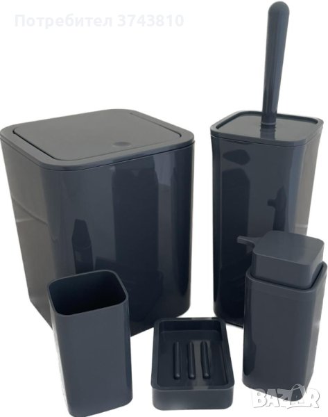 Комплект за баня от 5 части, с елегантен и изчистен дизайн в квадратна форма. Удобен и практичен за употреба, както и много лесен за почистване. Изработен от висококачествена пластмаса, издръжлива в различни среди. Комплектът съдържа дозатор за течен сапун, поставка за четки и паста за зъби, сапунерка, четка за тоалетна, и кошче за отпадъци.