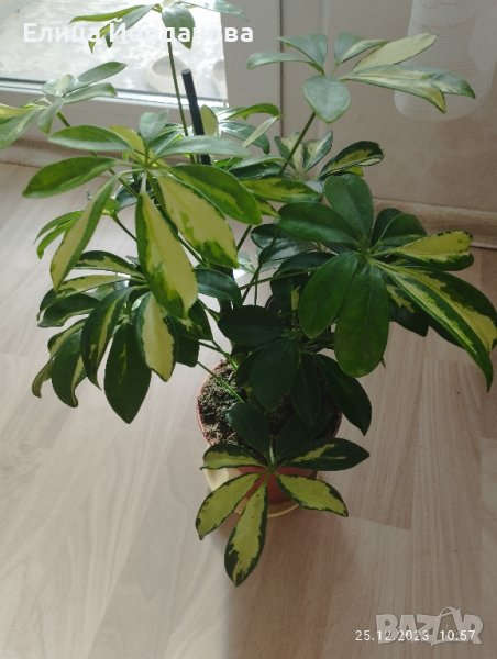 Пъстра шефлера, красива листна маса, право стебло, скоро не е необходимо да се пресява. Височина на шефлерата 13 см. без саксията.