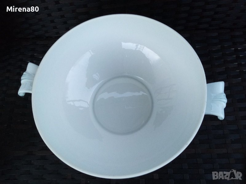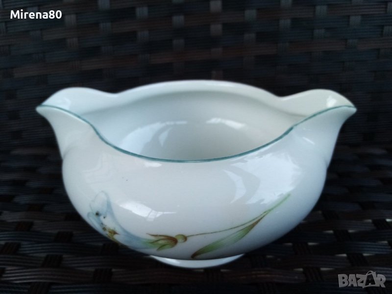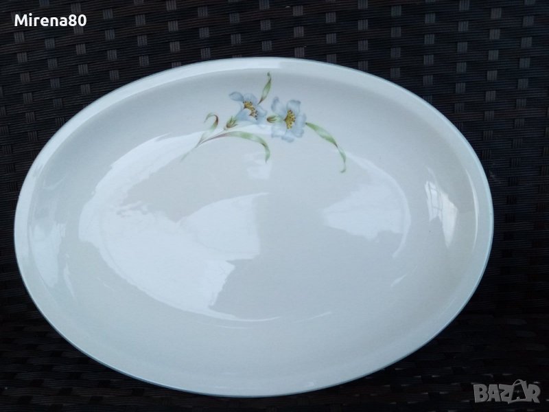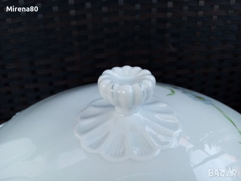 3 много красиви съда на около 100 г според маркировката. Голям супник (3 литра) , сосиера (12 см дълж.) и плато (37/27) . Невероятно фин порцелан - гладък, кремообразен, перфектен ! Красива флорална декорация и интересен сивкав кант. Отлично порцеланово здраве ! Маркировка.