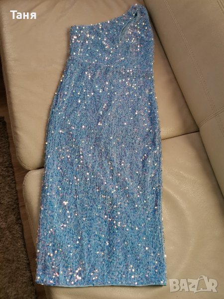Дамска рокля с паети, размер М. Роклята е с едно рамо стои много добре. При интерес от ваша страна ще измеря гръдна, дължина и др.