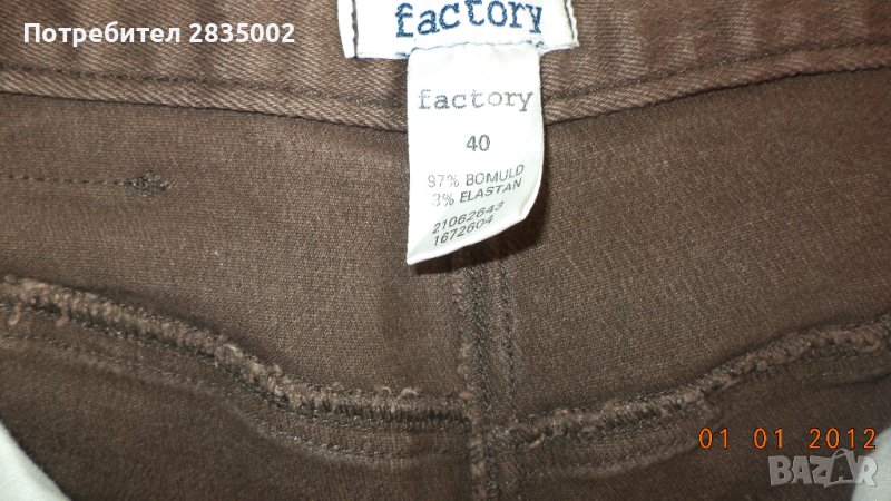 Снимки 1 и 2 - НОВИ ДАТСКИ маркови кафяви дълги дънки. Фирма FAKTORI. Номер 40. Талия 85, ханш 126, дължина на крачола от чатала 80. Мерките са в см. Плата е еластичен.