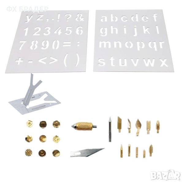 Комплекта включва: 22 броя накрайници, като всеки един има определено предназначение. Изработени са от месингова сплав, която придава добра тополопроводимост, 2 бр. шаблони, 1 бр. стойка.