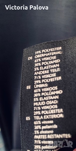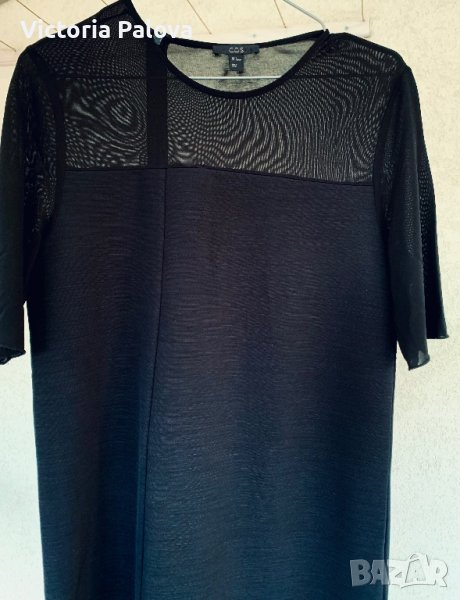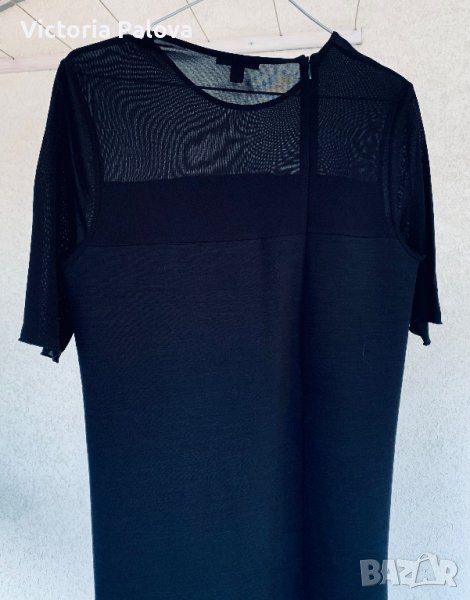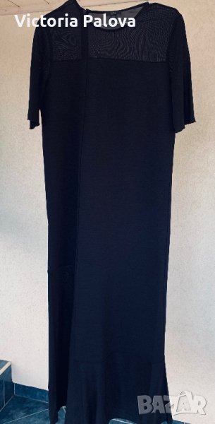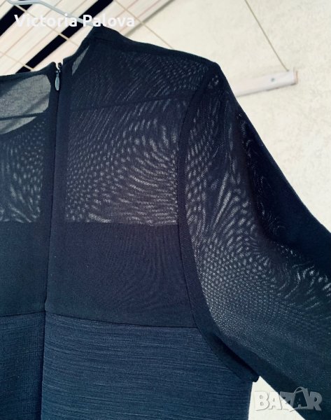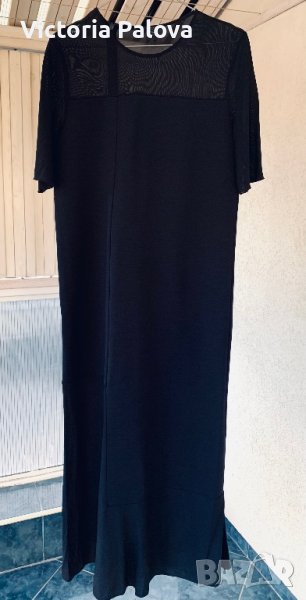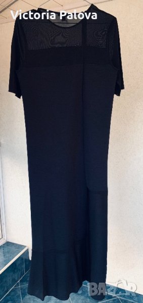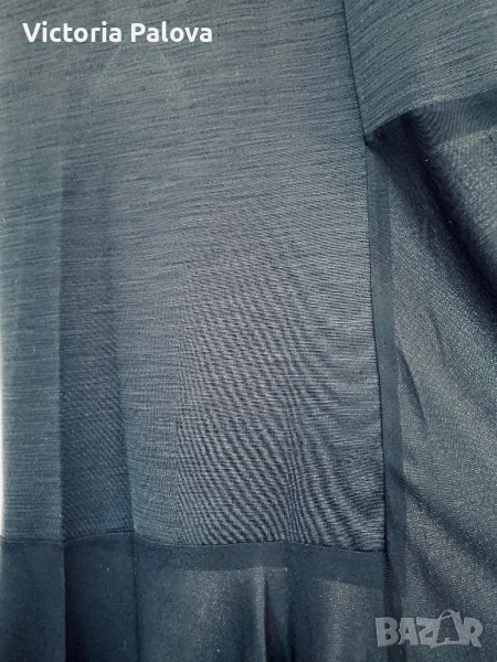 Роклята е много интересна, комбинират се два вида материя-плътна и прозрачна, на гърба ципът е асиметричен, не е по средата. Роклята е права, красиво оформя силуета. Рамо - 42см, ГО - 44-48см, дължина - 129см, талия - 46-50см, ханш - 48-52см. Роклята има разтегливост, но е плътна.