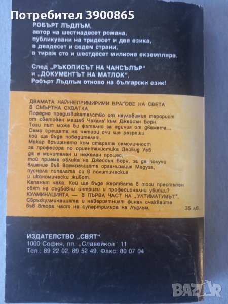 Продавам книга "Ултиматумът на Борн " - първа част от Робърт Лъндлъм. Издателство " Свят" гр.София. 384 страници.
