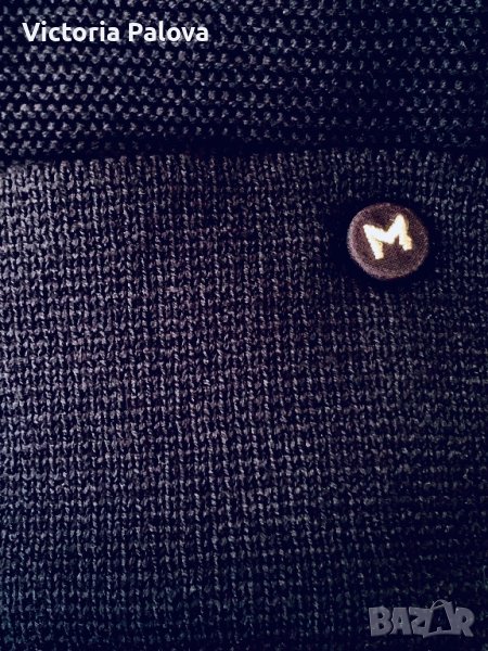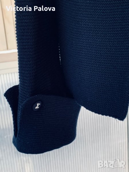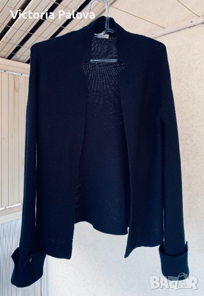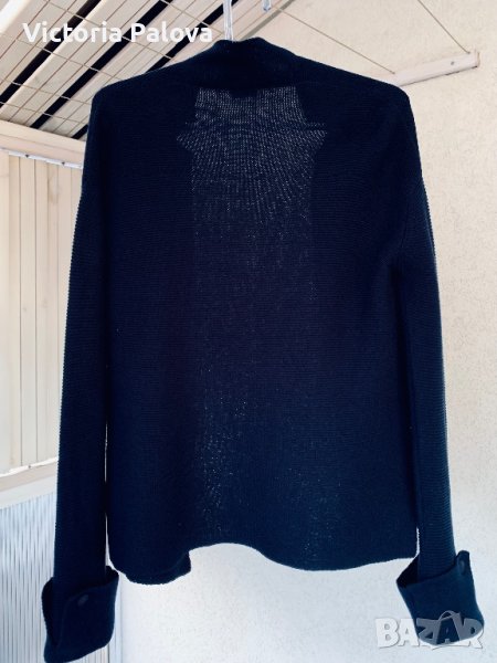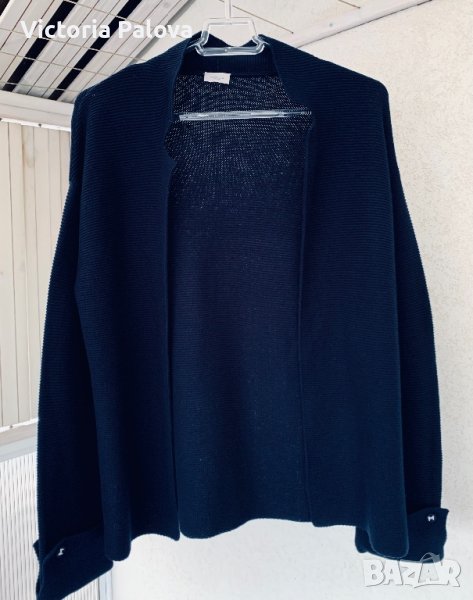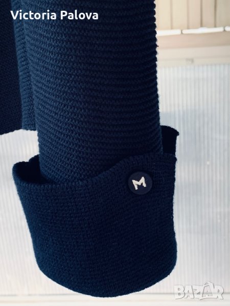 MAX MARA, предлагаща на международния пазар колекции със свеж и съвременен поглед в съответствие с днешните настроения и начин на живот. Жилетката е тъмносиня, без закопчаване, с изрязано на “М” деколте, с красив маншет с брандирано “ М” копче, отстрани с цепки 6 см. Рамото е паднало , 52см, ГО - 49см, дължина - 66см, ръкав от мишница - 54см. Жилетката има разтегливост.