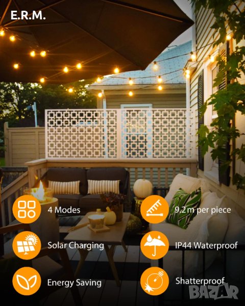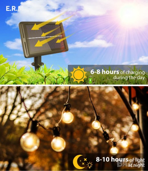 9,2 м външна слънчева светлинна верига: Всяка слънчева светлинна верига съдържа 25 G40 LED крушки, 2 резервни крушки, 7,2 м кабел и 2 м кабел, могат да украсят повече зони. Соларният модул от 2200 mAh работи при силна слънчева светлина 8 – 10 часа през нощта. Енергията идва от слънцето, така че не е нужно да се притеснявате за сметката за електричество. През нощта слънчевият венец може да създаде топла и романтична атмосфера за вас и вашето семейство.