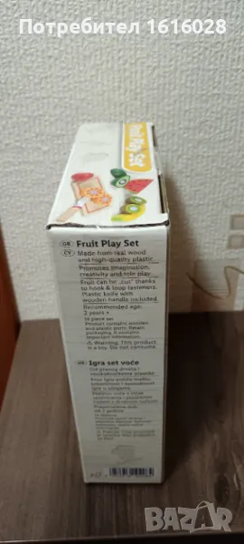 Нова детска дървенна дъска с нож и различни плодове,които са разделени на две части и се залепват с велкро една за друга.Комплекта съдържа 14 части.Произведена от качествено дърво и безвредни бои.