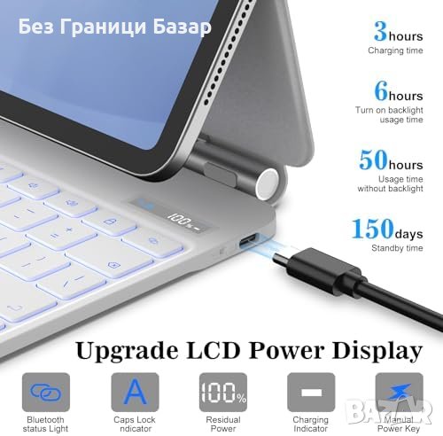 - Безжична Връзка: Bluetooth клавиатура с регулируема яркост и режими на осветление.