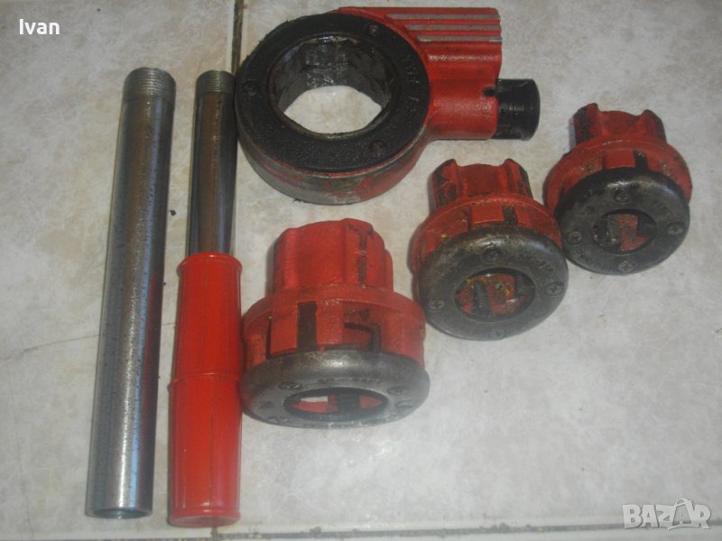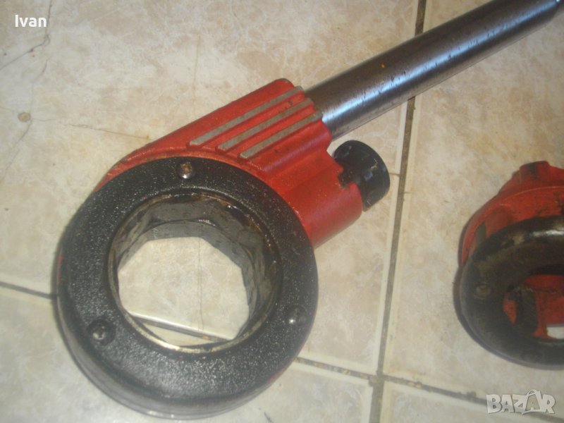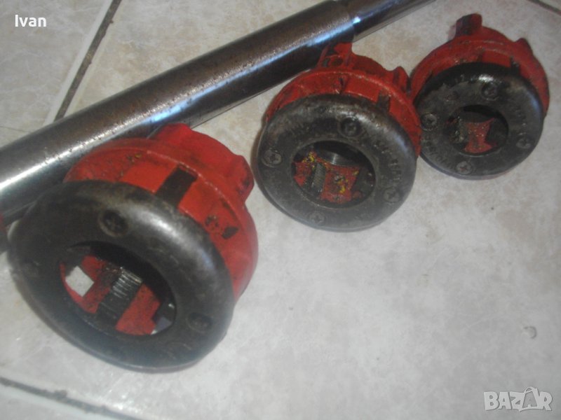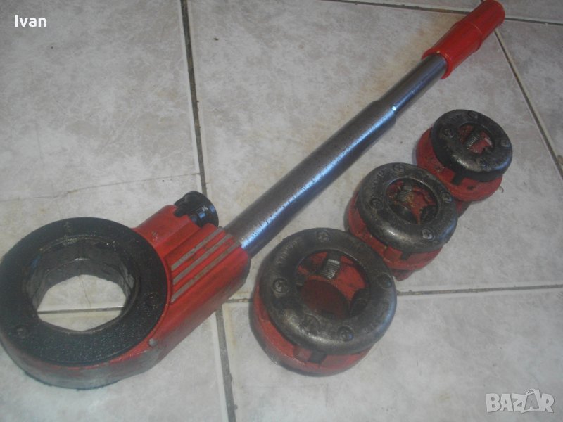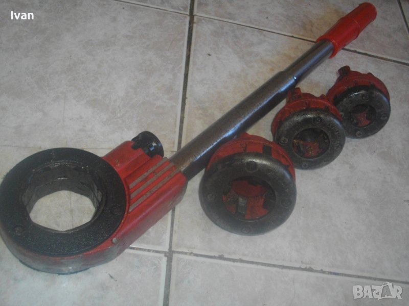 ОПИСАНИЕ на плашка винтонарезка червена с 3 резбонарезни глави. Цена 299 лв. Немски, ползвани, в отлично работно състояние. Марка и модел - BST Type 62. Имат съвместимост с ROTNENBERGER. Дължина на тресчотъчната глава с поставени тръби дръжки - 52 см. Размер на главите 3/4 цол, 1/2 цол, 1 цол. Тресчотката работи изключително реко и бързо, без запъване. Тегло на комплекта - 3,2 кг. Цена 259 лв.