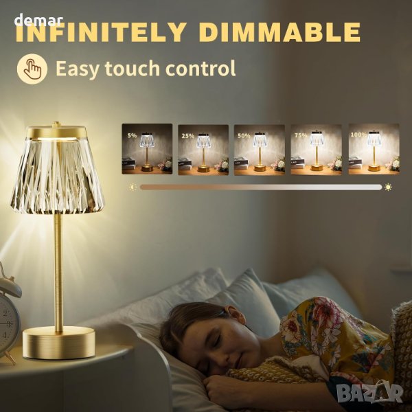 Насладете се на лукса с кристалната лампа, включваща диамантени кристали и златист метал за романтична и комфортна атмосфера. Батерията му от 4000mAh предлага преносимост, издържаща до 8-24 часа в зависимост от интензивността. Насладете се на безстепенно затъмняване и 11 RGB цвята, за да настроите настроението. Здравият дизайн и първокласният акрилен абажур го правят стилно допълнение към вашия декор. Това е перфектен избор за подарък за любими хора.