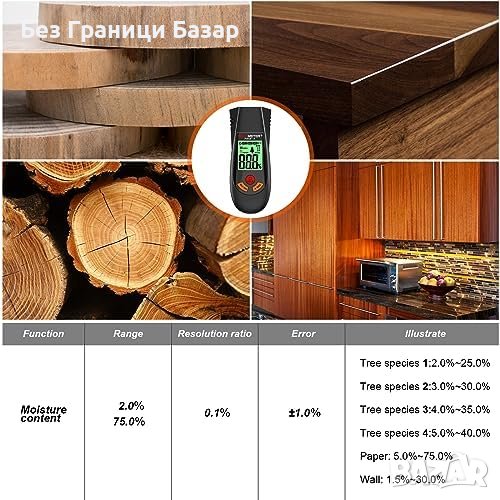 - Диапазон на измерване: Дърво: 2.0%-75.0%, строителни материали: 1.5-30%