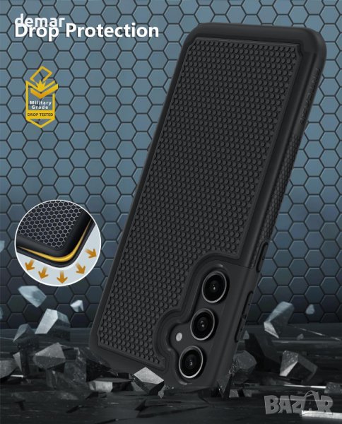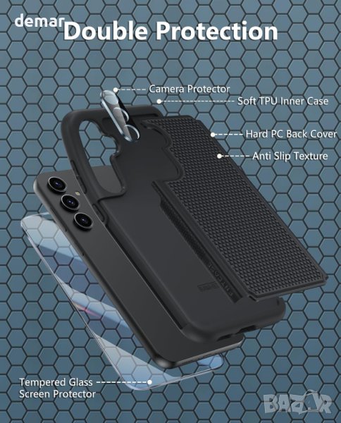 Защитете своя Samsung S23 FE (пуснат през 2023 г.) с увереност, като използвате изчерпателния калъф. Включва премиум HD протектор за екран и протектор за камера, предлагащи пълна 360-градусова защита за вашия телефон. Издръжливият хибриден калъф съчетава здрав външен капак на компютър с мек вътрешен калъф от TPU, за да устои на удар и да абсорбира удари. Неговият противоплъзгащ се модел на пчелна пита, устойчив на пръстови отпечатъци, предотвратява случайни изпускания, докато повдигнатият с 2 mm панел предпазва телефона ви от драскотини, петна и прах. Насладете се на прецизни изрези за лесен достъп