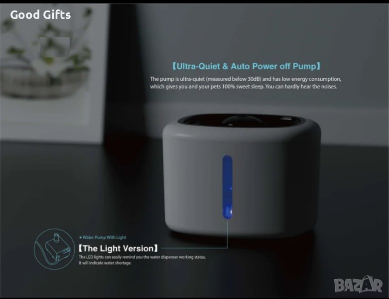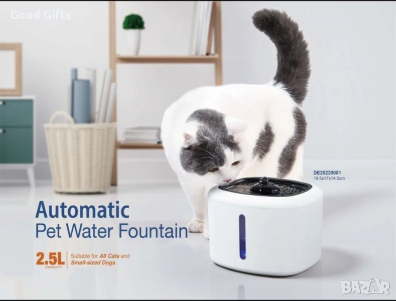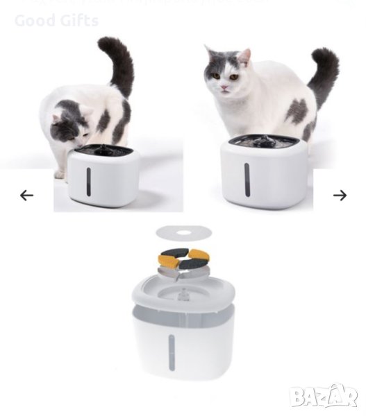 Фонтан - поилка за котки и малки кучета, 5V, 0.25W. Разполага с голям резервоар за вода с индикатор за ниво, помпа и филтърна шайба с активен въглен. Със здрави памучни влакна, йонообменна смола и гранули от активен въглен, те поддържат водата чиста от косми и други замърсявания. Работи с USB кабел и помпата се нуждае от почистване веднъж месечно за най-добри резултати.
