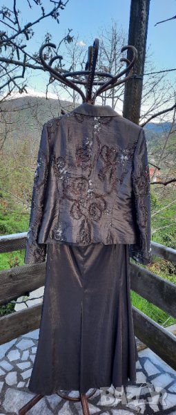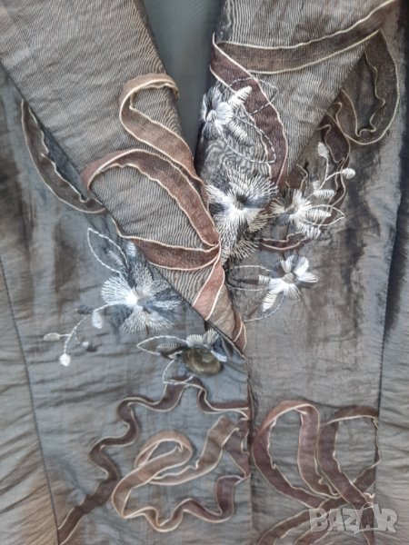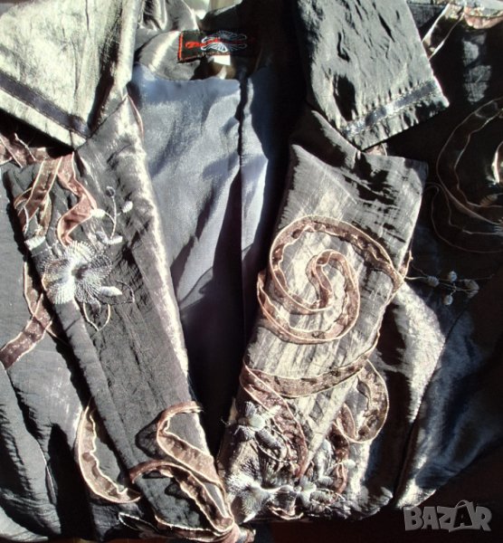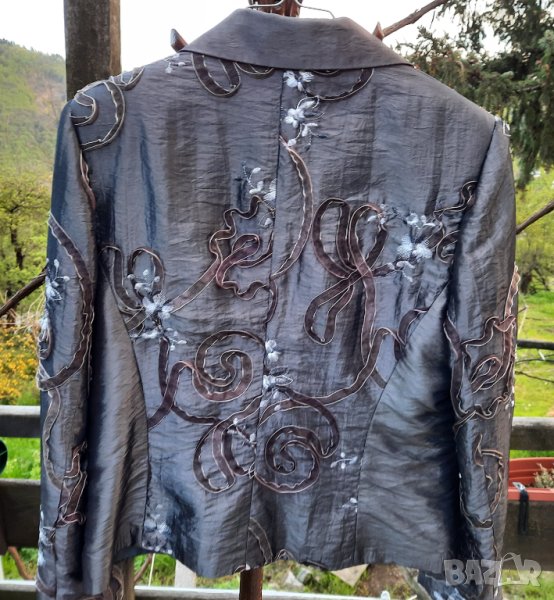 Сако с апликации и бродерия, подплата, 1 копче, без джобове. Гръдна обиколка 50 см. едностранно, рамо 13 см., ръкав 63 см., дължина 56 см.