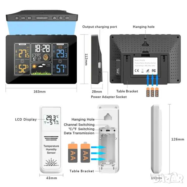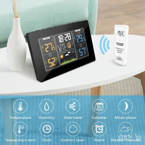 Метеостанция с голям цветен екран. Размери на вътрешното тяло: 163 х 112 милиметра. Станцията показва дата, час, вътрешна и външна температура и влажност на въздуха. Може да настроите аларма за събуждане. Може да следите и фазите на луната. Станцията разполага с един безжичен датчик работещ на 433MHz (обхват до 100 метра при пряка видимост). На екрана има и прогноза за времето, представена в 6 различни картинки. Захранва се чрвз батерии и захранващ адаптер.