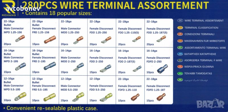 Пълен набор от 18 вида конектори за кабели, в практична кутия с разделители, с широко приложение