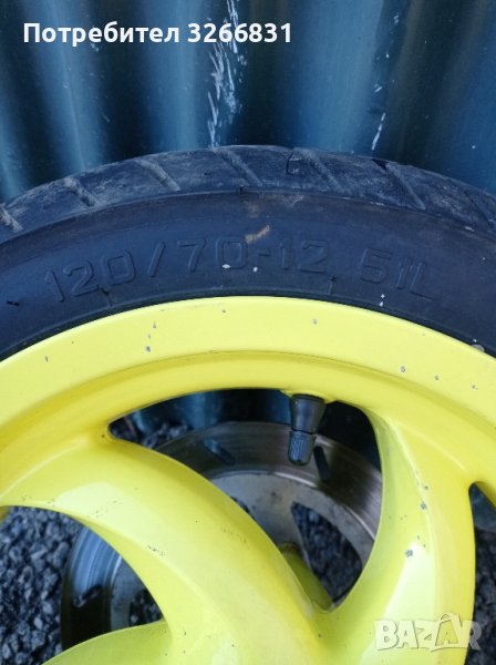 оригиналниа италианска джанта Grimeca за скутер Пиаджо, перфектно техническо състояние на всичко което виждате на снимките, цена за гумата Пирели 120/70 - 12 , която е като чисто нова - 15 евро, джанта за 15 евро, спирачен диск за 15 , оста е 10 евро и охлюва за скоростомера - километража е 10 евро, приемам оферти за всичко заедно и поотделно но не по малко от 35 евро.